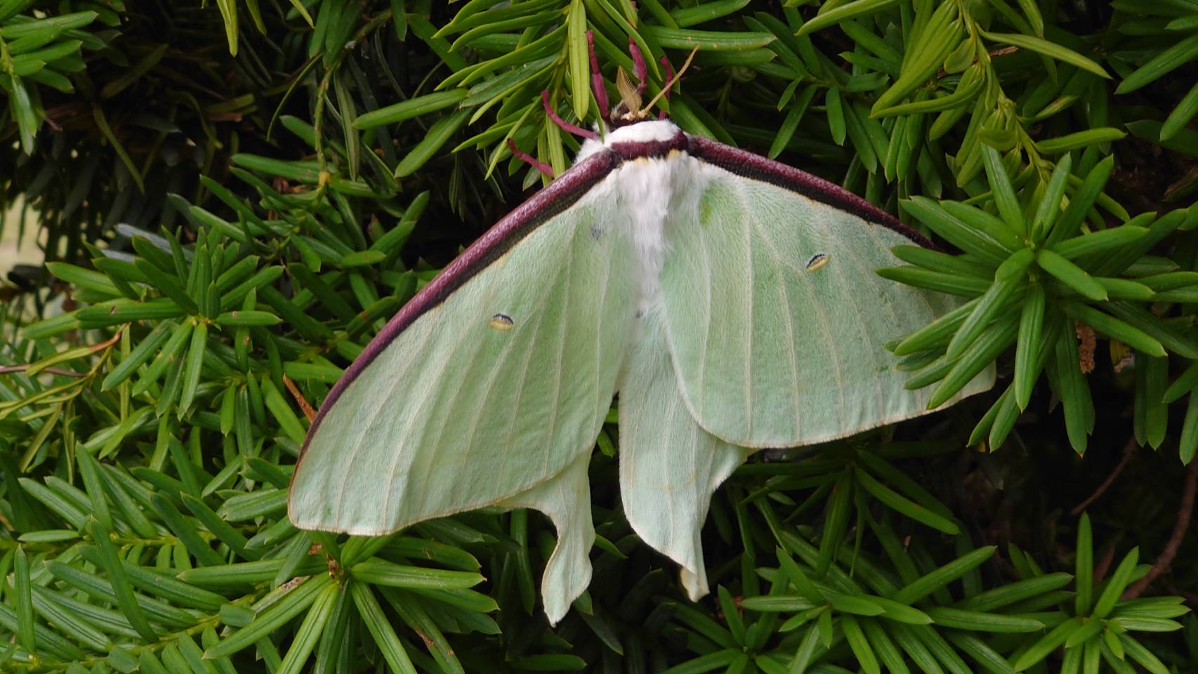 噂通り、美しい蛾です。去年出会ったとされる(下の写真の)方が、羽化後時間が経過した通常の薄緑色の体色だと思います。